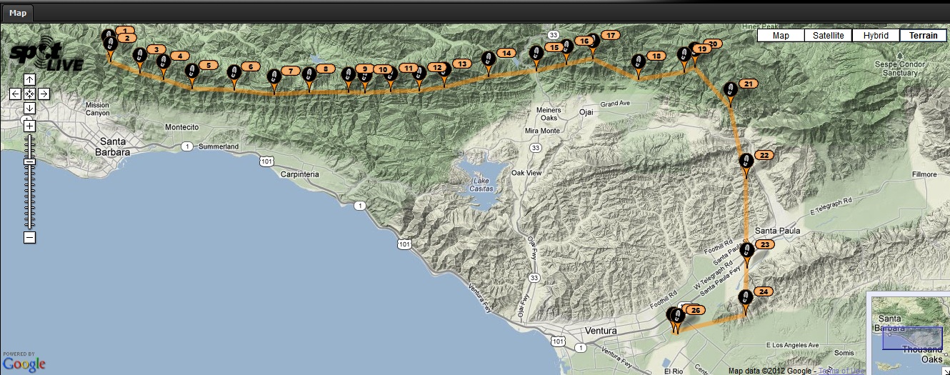 That was one of the most fun days flying I've had. There was pretty strong NE above 5k, but other than that the lift was wide and smooth. I flew through Santa Barbara with Doug, trying to catch up to Andy, who was one point ahead showing us where the lift was. We weren't much higher than the ridge line on Castle and Power line ridges, but all the spines through the pass, even east divide, were good for 6k+. It was nice being able to look around and enjoy the view from the pass while Andy hunted out the lift ahead :) . The crossing to Ojai was easy...went straight to Spine 1, then got a boomer from Nordhoff to 78. I expected to push into Fillmore, but on the glide to Pucker's hit a wall of NE. At that point the air also got pretty bumpy. Changed from coordinated circle mode into managing the turbulence, but even with the sloppy turns and pitching went to 7k...all while getting pushed out of the mountains (topped out over Thomas Aquinas). The NE was stiff enough that Fillmore didn't seem possible, even with 7k (wind report for Fillmore at 2:50pm says ENE 25G35). I've seen SD push South across across the NE/SW convergence seem and thought that may be possible, so aimed for South Mountain. Only lost 2k on the glide, but NE drift caused me to intersect on the SW tip of the ridge. Not much organized lift there. Camarillo looked possible...but would have been near the airport. Decided to go down the Santa Clara river toward Ventura, hoping to either bump into the seam or get close to the 101. I soon realized this was not a good place to be due to air traffic and spiralled down to the riverbed on outskirts of Ventura.