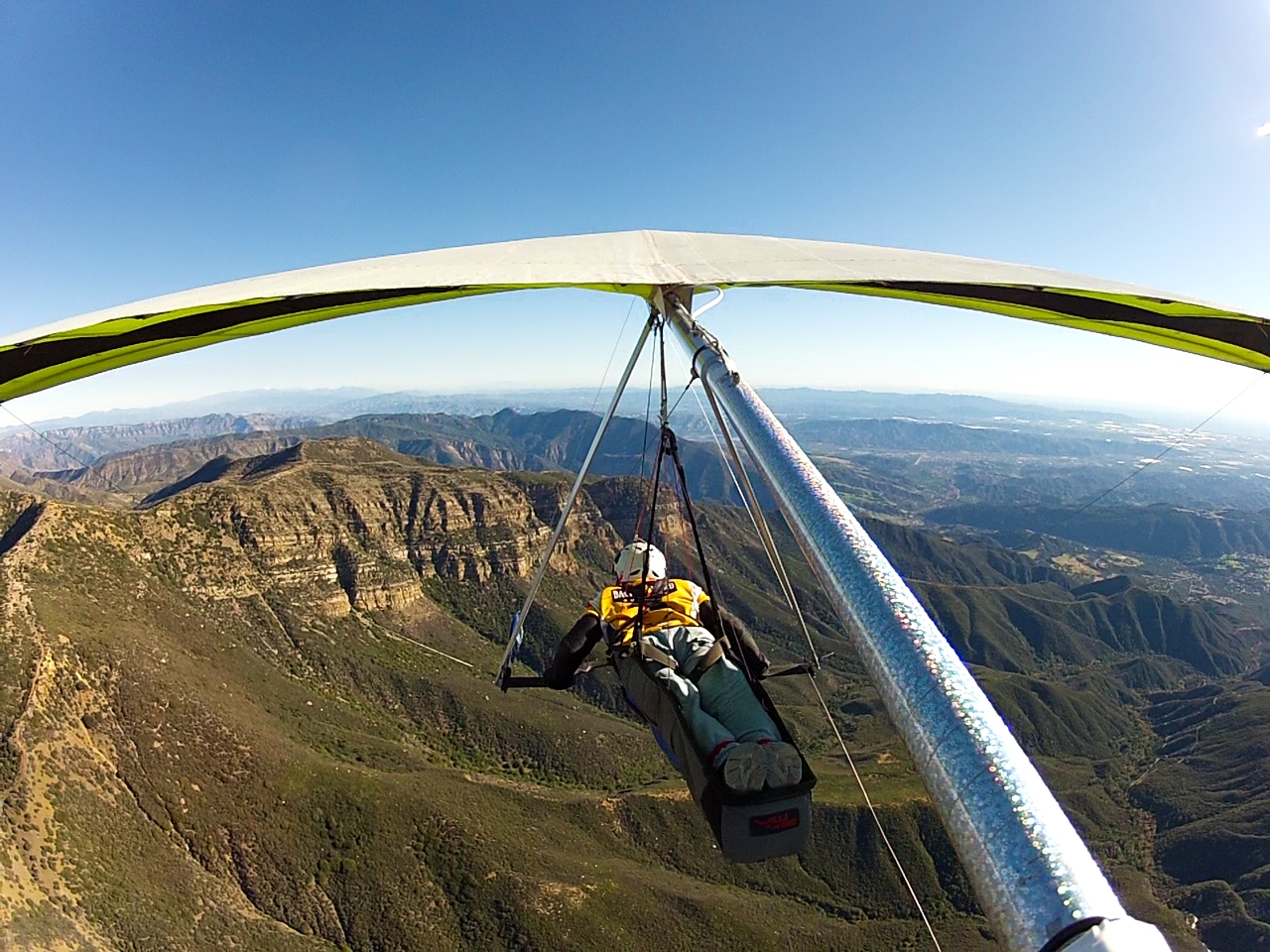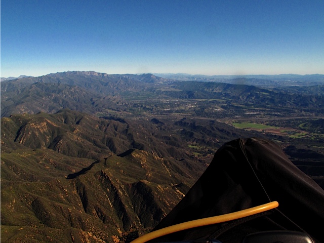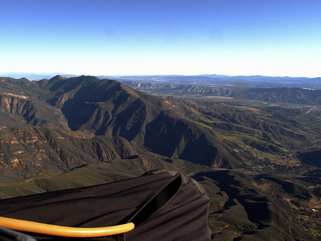 An epic day! Lots of pilots flying high and far. Tim and I chased Aaron west over the 154 as far as lizards mouth before hitting some west wind and turning back eastbound for the flight towards the pass and onto Ojai. As we approached la Cumbre Dean come over the radio that he had top landed EJs and was about to relaunch. Way to get it! We had some easy gliding eastbound and a good climb or two to get us to the powerlines where we got stuck low on the ridge for a while. Considered flying out to Bates at this point but went back upwind in search of a trigger that might work better than powerlines ridge which just wasn't delivering. No deal. Turned back to powerlines again, nothing. Finally decided to continue east just a bit more in search of a climb before throwing in the towel and quickly got a climb that took me to divide peak, then stepped it up some more for the transition to the front of white ledge. I was climbing while gliding up the front of the peak and over the pass. Long downhill glide towards the 33 and onto the nordhoff massif. Made it to the upper Ojai valley and just a short glide away from the Santa Paula ridge, but I was a little nervous about continuing on due to the east wind blowing down through the Santa Clara valley. Turned back for Nordhoff high school where Aaron and Tavis had landed. As I made it back to the Nordhoff ridge Tom was arriving from the west on the tandem with Stefan, his second flight of the day. We landed at the high school, met up with Aaron and Tavis. Peter drove retrieve. Thanks Peter! 5 hours 7 minutes, 65 miles around 3 turn points. Awesome day flying with friends! Doesn't get any better.