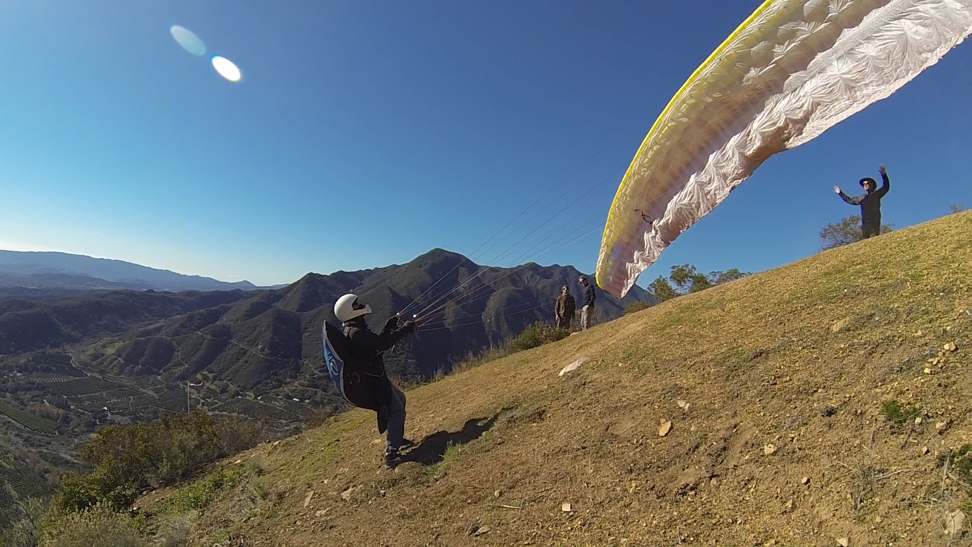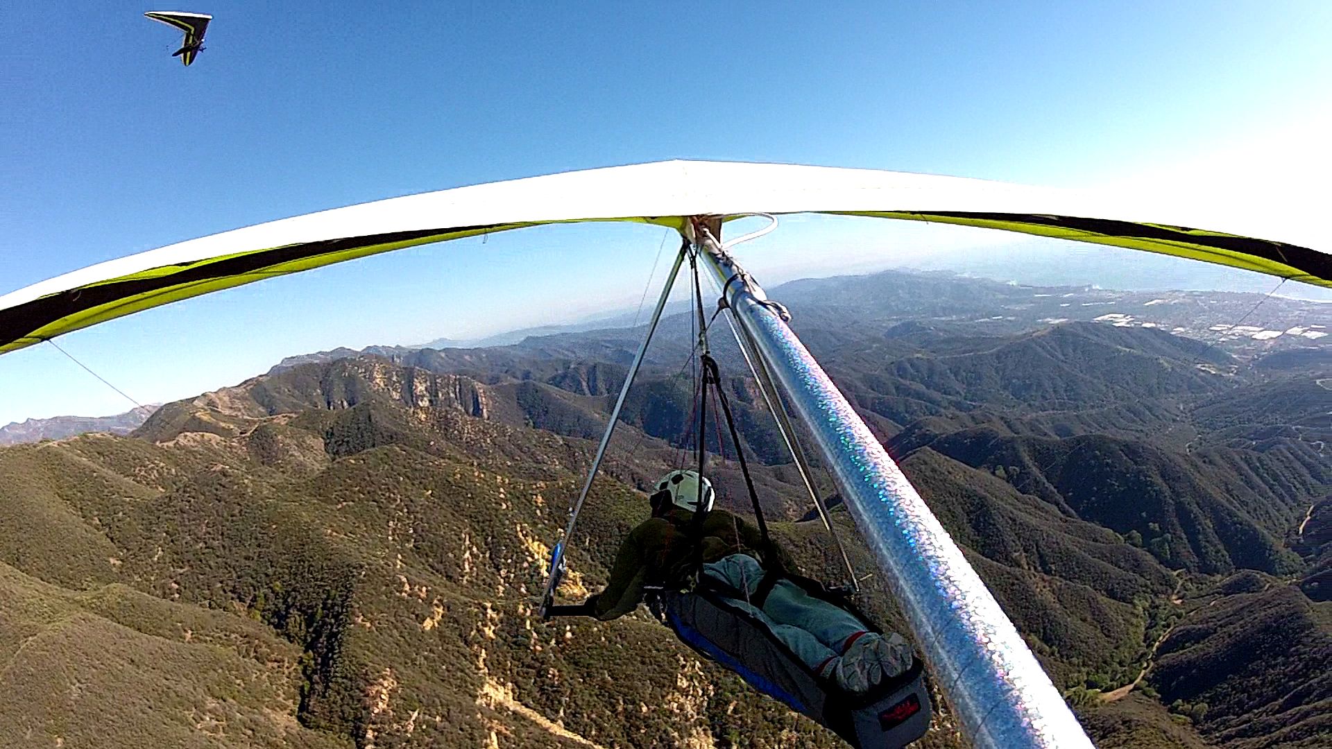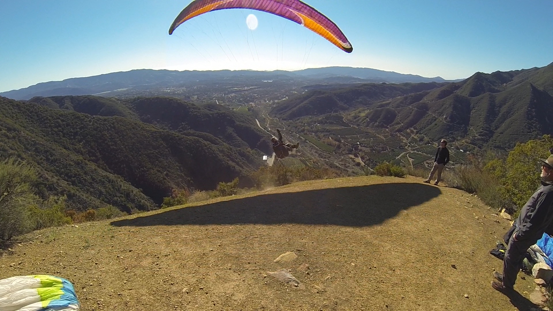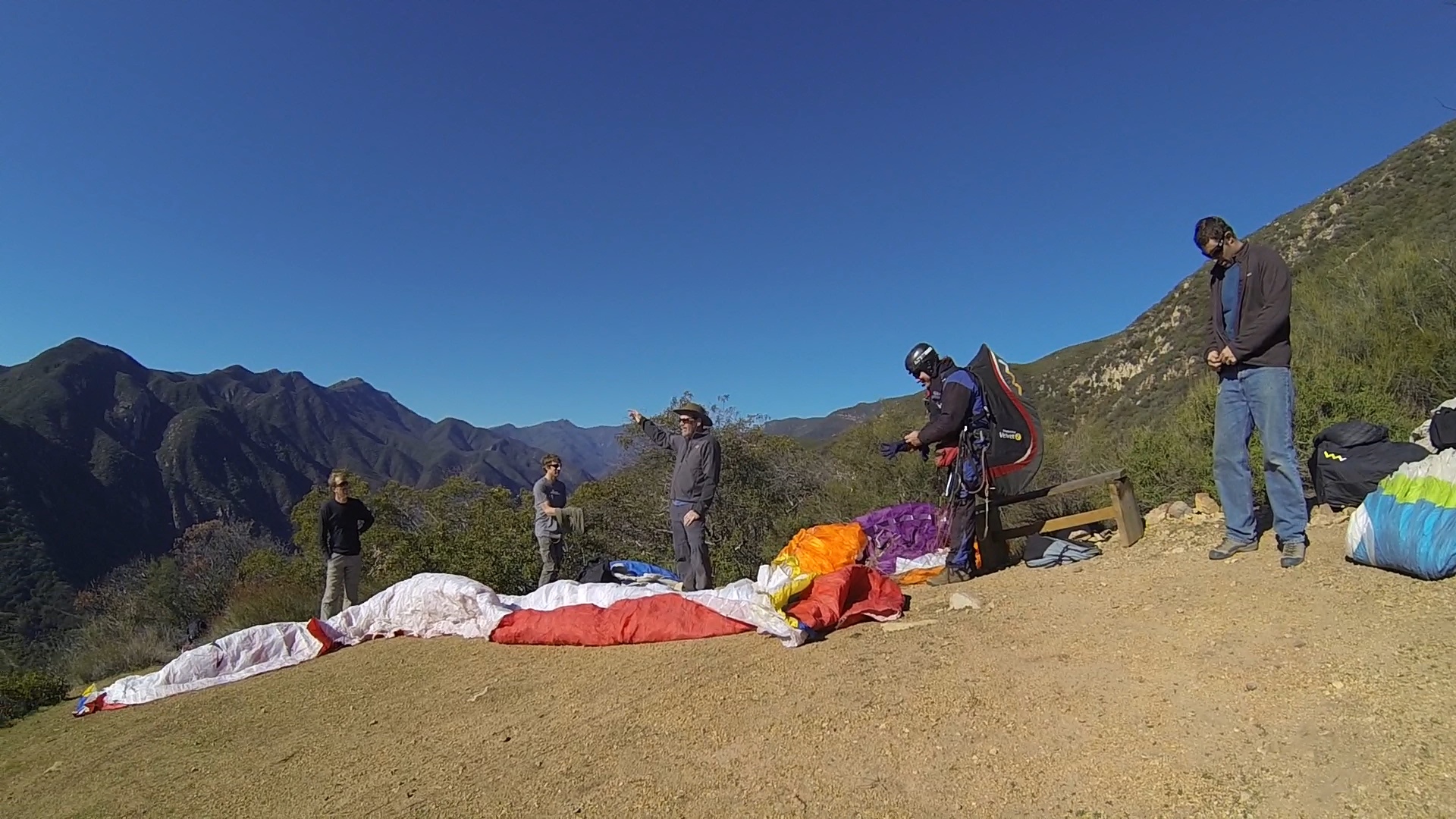 What can I say but a GREAT start to the New Year with 6 of us launching the Nuthouse in Ojai and all making it over the pass to SB (5 landed Elings and Ron landed E Beach). Beautiful hike in the cool weather to launch. It was my first time launching there. It's a smallish but immaculately clean launch site. Handtools are kept up there for continued maintenance and SD got to it as soon as he was on launch. I brought a go pro but unfortunately forgot the mounting clamp so I didn't take much in the way of in air footage. Tim, Aaron and I got stuck low over the peak of Whiteldge for a little bit and I really wish I had the camera going then while the 3 of us circled together closely hoping for a climb that would let us chase down SD on his westbound leg. Got a great climb over 4000' at the RR that made for an easy glide to Elings to join the party. As soon as we can do another flight from Nuthouse westbound I'm in!