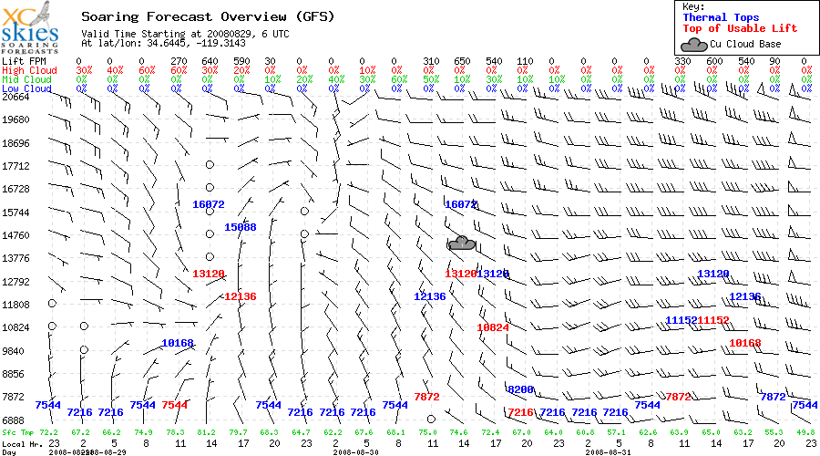 Days and hours are across the bottom axis, altitude is the vertical axis, top of usable lift in red, wind barbs show direction.