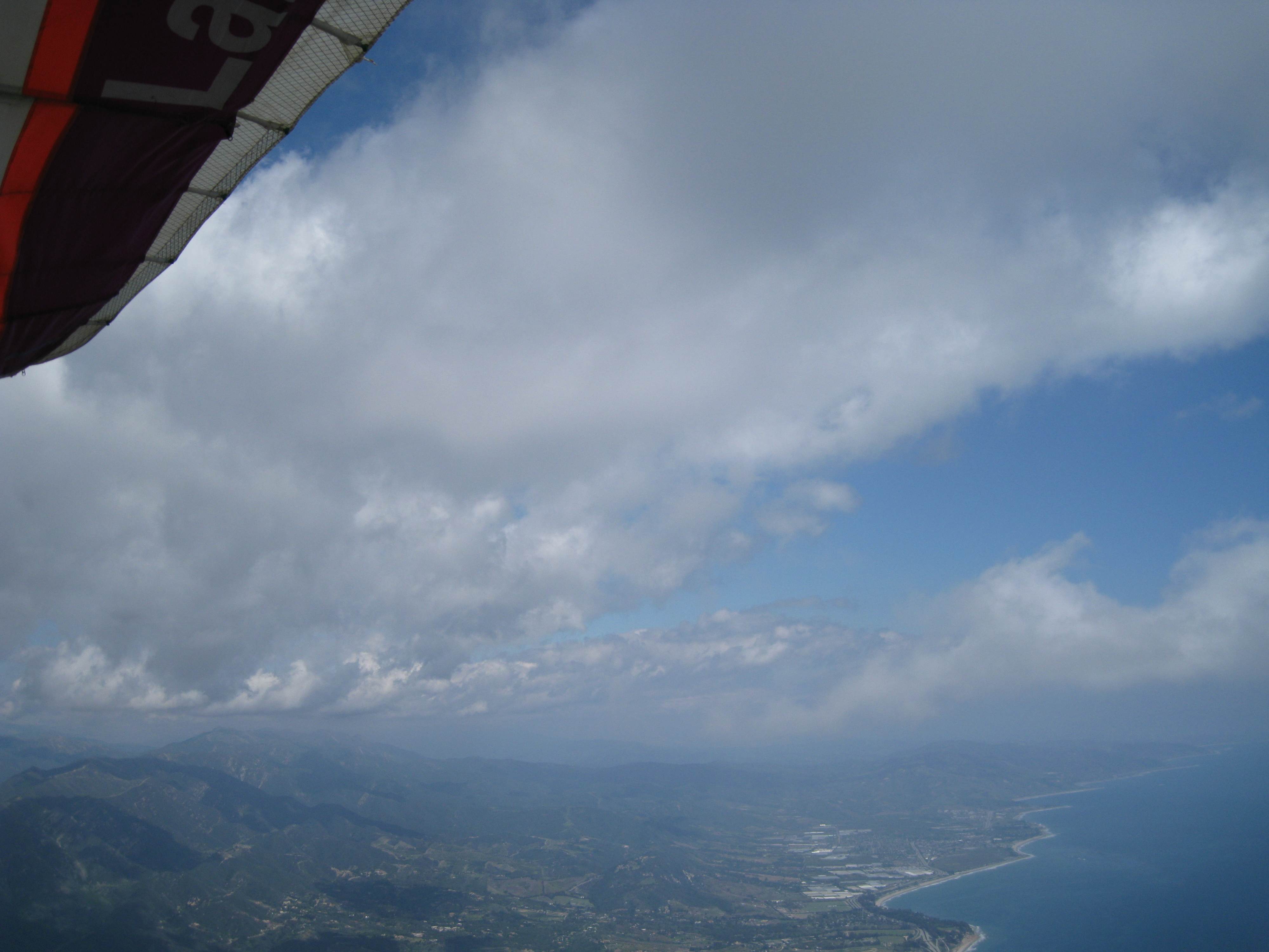 Nice conditions this afternoon today at Eliminator. As the north winds backed off the peak, the cycles were coming in lightly. No down drafts as clouds developed and pushed out overhead. Launched at 2:03. Found lift over Round House and Antenas to 3500'...pushed out to Lower Parma and worked good convergence lift to 4600' over Sycamore Canyon and Eucalyputus Hill...Turned down coast, dolphined with a 10 mph tail wind and made the bluffs at Bates with 750'...where it was light SE, E on the beach. Some edginess in the mtns, but not bad though, 1100 up and 1400 down. Many thanks to Marge for pictures and chase !!!