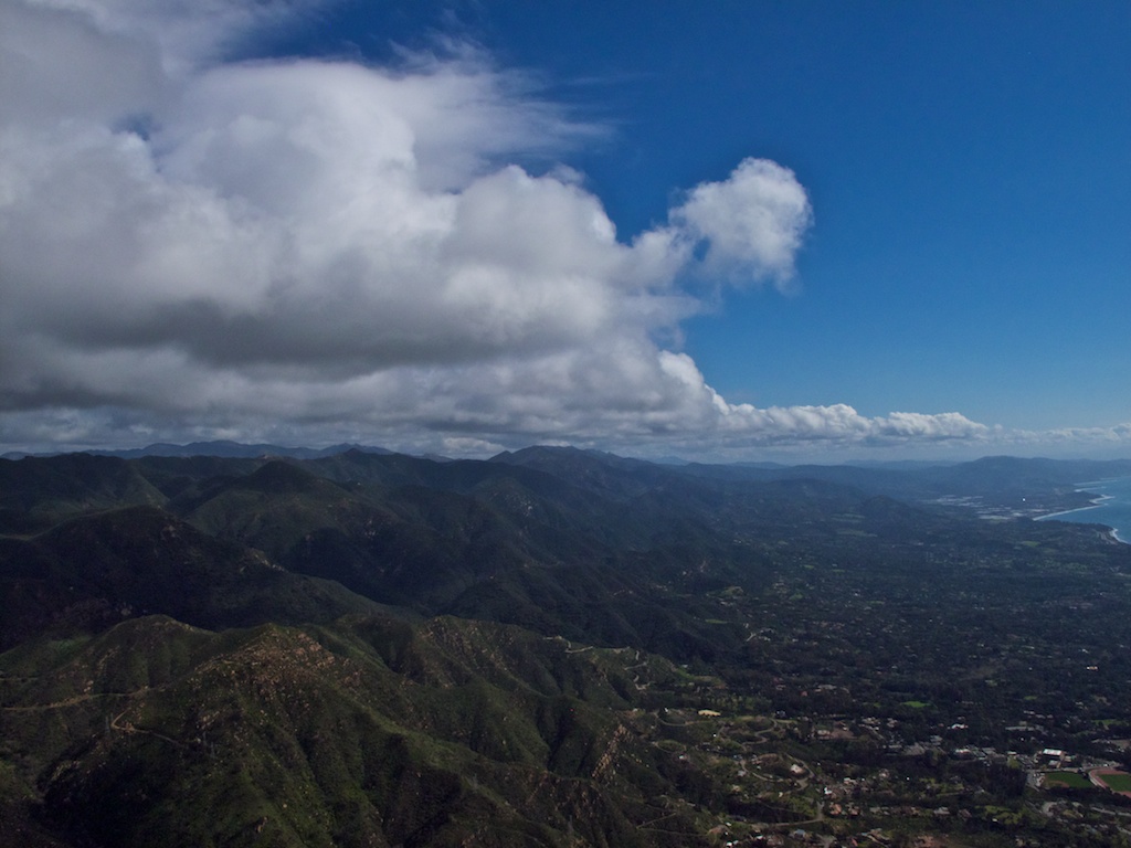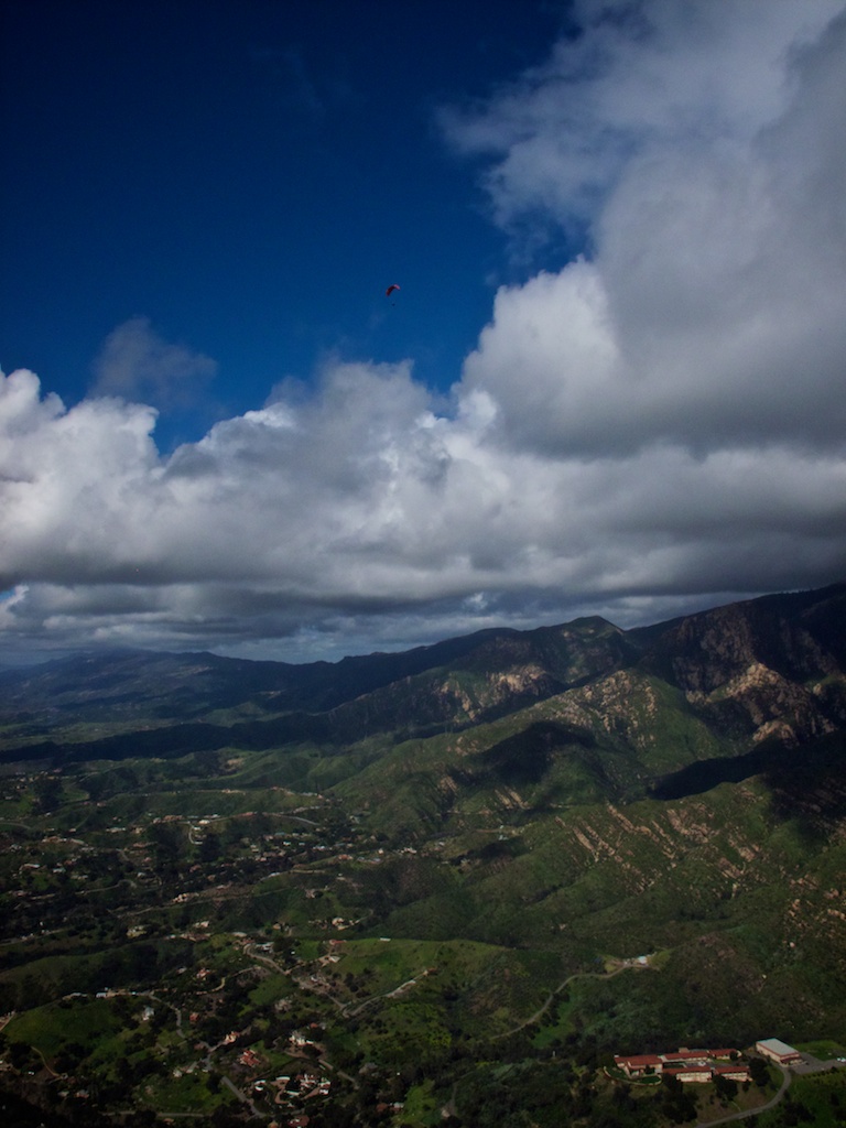 The flags were snapping and the dark cumis were streaming overhead when we launched. 4,300 at the R&R and had a seven mph tailwind to LaCumbre Peak. Strong southeast wind made the peak a turbulent place to hang out. It was dark there so I put it on full speed bar and crawled back to the R&R at 16 mph. Got up into the low 4's with a hang glider at the Thermal Factory - it got dark there, too - so I zipped out to the Rock where a mellow boomer put me back up at 4K and I headed to East Beach. It looked beautiful down range, but I found out I don't fly well now without a vario (mine kept fading and locking up) and the winds aloft sent me packing. Still, it was gorgeous over town.