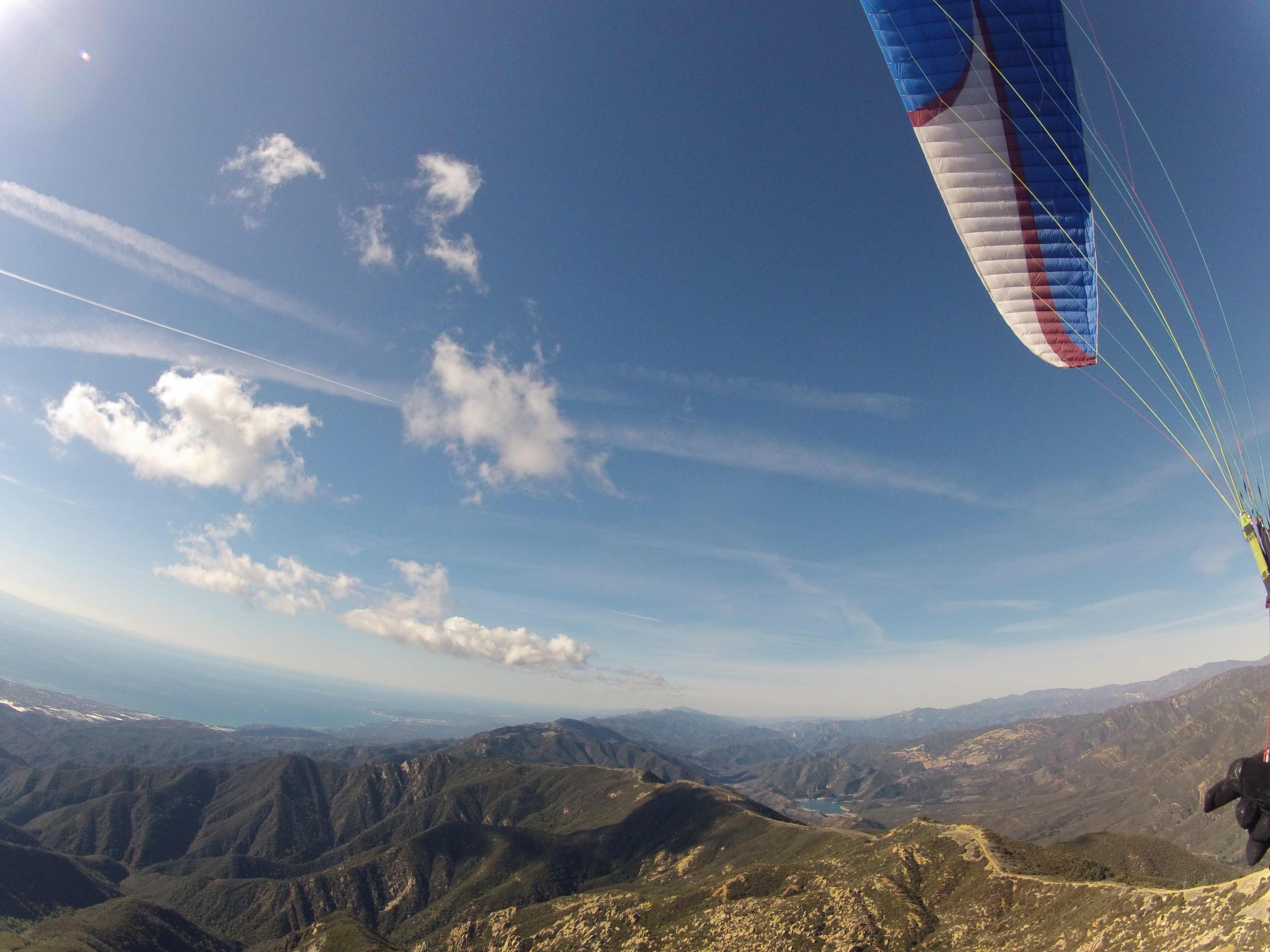 Less than a dozen of us rode in the Eagle van ahead of the FAA van. It was blowing in at both Skyport and EJ's. We started launching EJ's at 10:40 AM. I turned right to La Cumbre Peak and within minutes was near the wispy's cloudbase at 6,300 feet. I headed east and picked up Andy Dainsberg at the R&R. He can relate how he scrambled and hitch-hiked to make a similar launch time to mine. It only took seven thermals to make it through the pass to Ojai: La Cumbre, Montecito Peak (6,400 ft), glide all the way to Powerlines where Mr. Monster boosted us back to 7K, Noon Peak, Divide, White Ledge and Bump 2 - all in the high sixes. Andy took the back ridge after flying mostly out front to the Powerlines and I took the middle road. It was the perfect day with lift everywhere and a tailwind giving us ground speeds of 25-35 mph.
