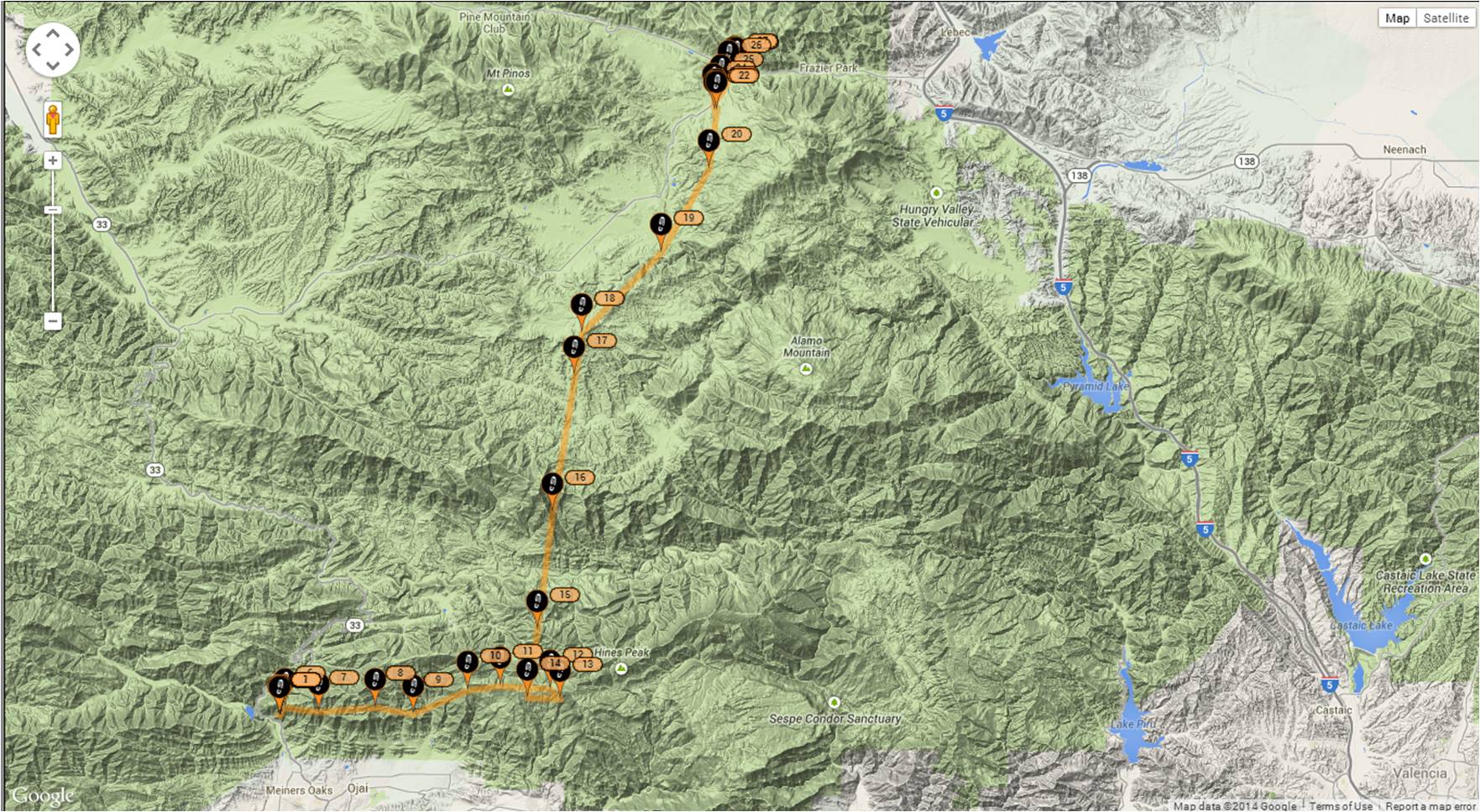 From there skipped downwind across Grade and Lockwood Valleys on a few more weak thermals, never getting more than ~8.5k. It would have been better to be deeper, more towards Alamo mountain, but also much more commited. Hit a lot of sink before arriving at Frazier mountain. The north side was shaded in, but I didn't have enough altitude to push around to the south side. Ended up skirting around the north side towards Lake of the Woods. Wind on the ground didn't seem bad, but when I got low, I had very little to no penetration. Came down semi-controlled in chapparal about 1/2 mile from the lockwood valley road. The wing was pretty tangled in the bushes, so I stuffed it in the bag . Eddie was offering retrieve, but before that, someone saw me on the side of the road stopped and offered a ride back to Ojai. :D I was happy to get a flight OTB from the front range. Maybe next time I will come more prepared to go deeper.