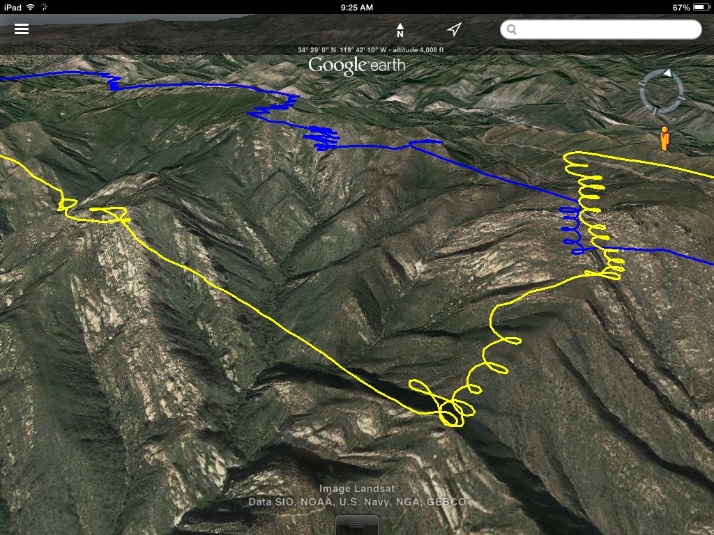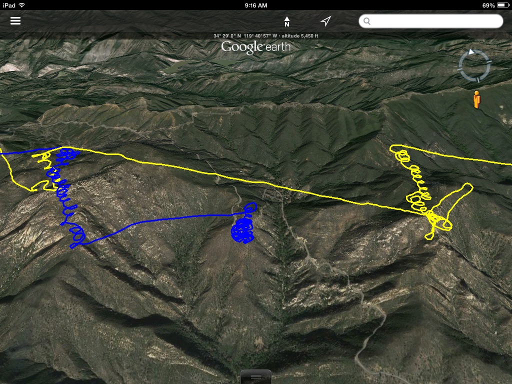 Both launches had sweetly firm cycles. Today, both launches I got to 'slope soar' the spine above launch trying to use the good lift to learn the topography around the road and Eliminator, etc. One note, as I went over the launch pad, I dropped really fast in a downdraft, i did make it out again, but mental note that with great lift comes great sink... I know that, but somehow keep forgetting... one type of condition doesn't mean it will always be there, need to always keep a cushion for the pushin.