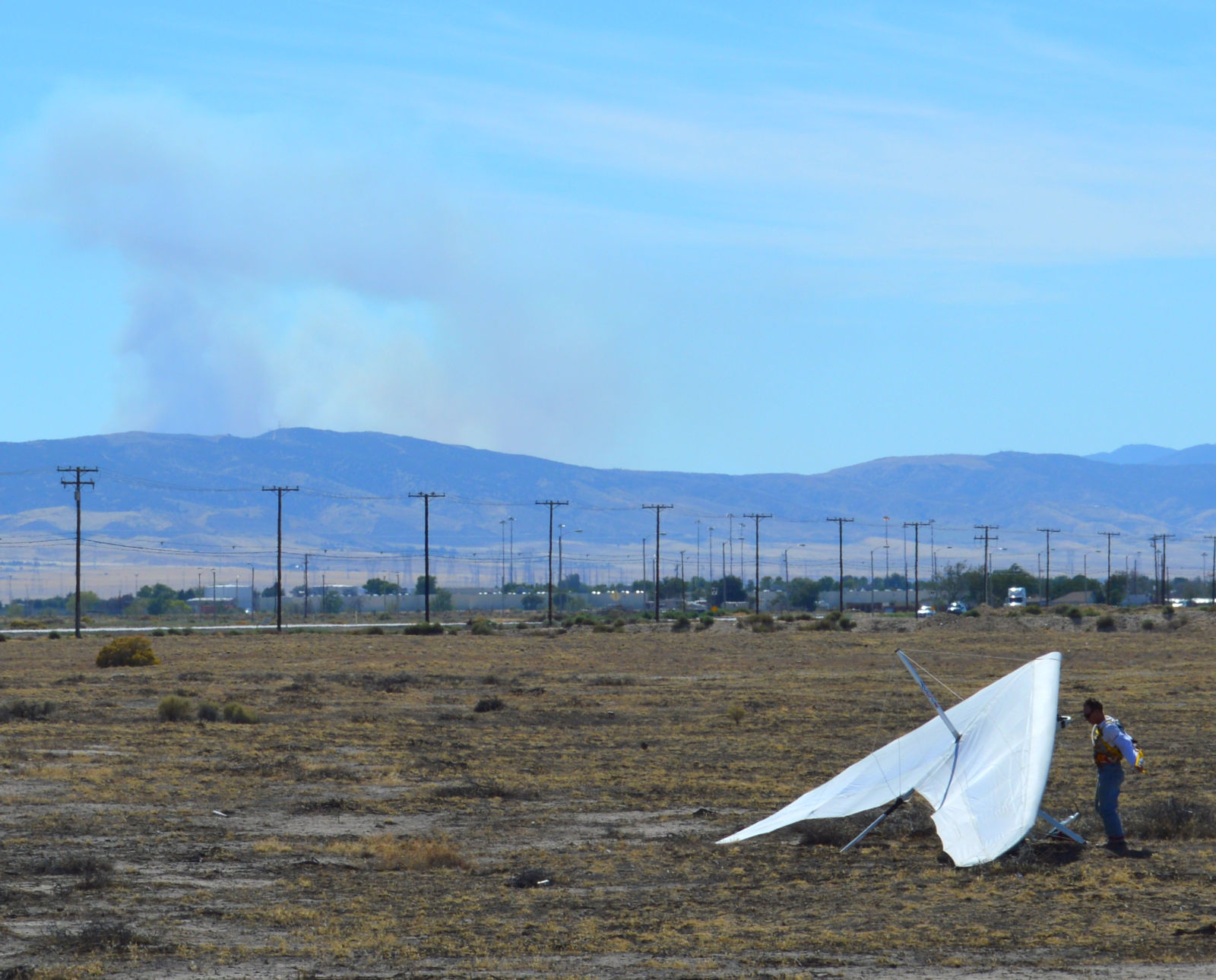 In the case of Sunday's flights it wasn't a cool sea-breeze per se that was blasting out of the SW 18 gusting to 30mph. Surface temps were 107F when I landed. Here I am just a few minutes after landing. The Castaic Warm Fire smoke plume is in the background. It was not easy task to get my glider broken down and bagged without having it blown over into the thick dust.