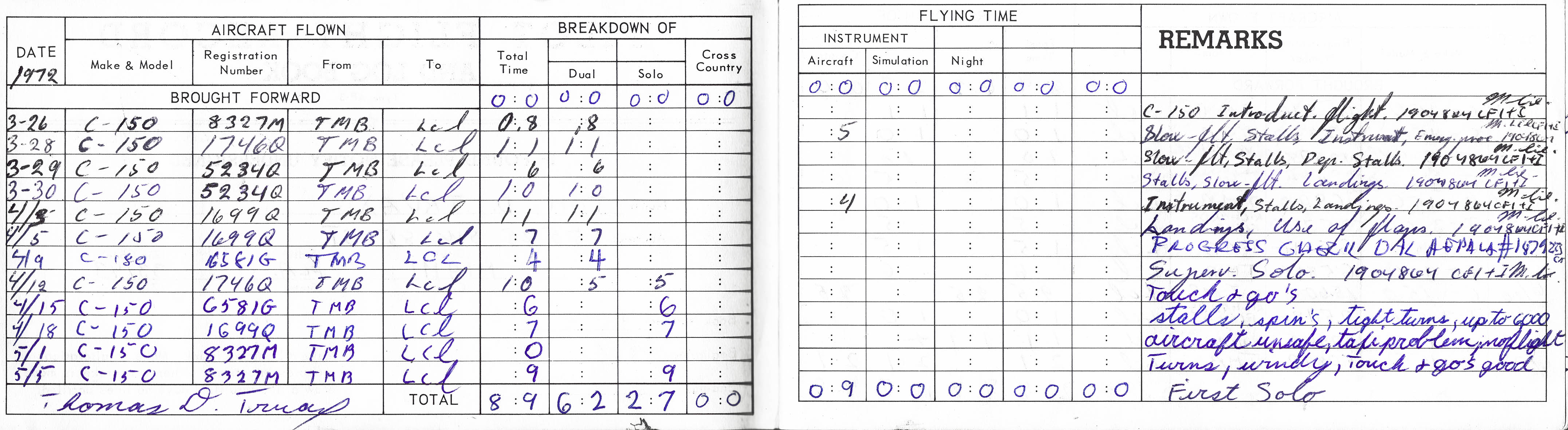 Tom's flight log page 1 / 1st solo 4/12/1972