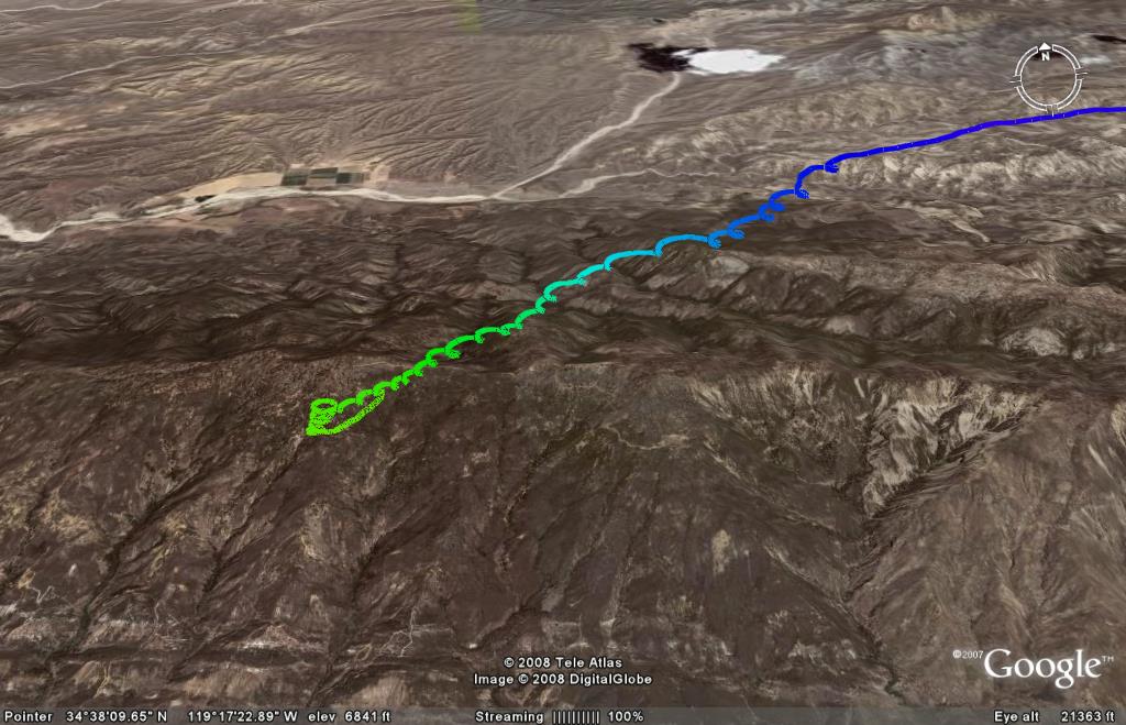 John Scott called it again! Hooked up with John and Diablo with Carolyn and went to Pine. Turned out to be an epic day! Tony, as always, lead the way with myself and John tagging along in the dust. Diablo had the day as he set a new Pine Mt. site record of 208 miles. Congrats!!! Hammer's flight was a weak runner up...max alt. 14500, max climb 1400, max speed 49 mph, flight time 2:51:40, distance 110 miles