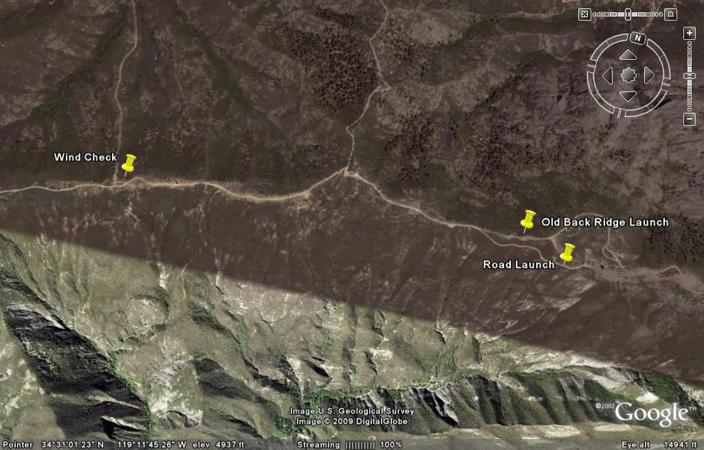 I'm not sure where you got the information about Chief's. As Chris writes HGs fly from there all the time. When you get to the summit on your drive up to launch you get out to check the wind direction; If it is blowing OTB from the NE go to Nordoff; if it is blowing straight in, Chief's. There is another launch called the "Back Ridge" located in between the summit and Chief's. We used to be able to drive up to it, but it is now blocked so we just take off from the side of the road right below (see below). You use this launch when you're to lazy to drive all the way out to Chief's. Or when the winds are waffling back and forth at the summit.