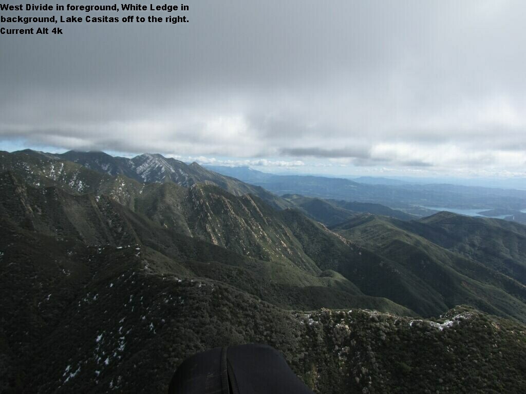 Wow. With all the posts and pictures from Dean and NMERider the whole day comes into focus. Dean's and NMErider's pictures are so different than most of my flight which was under considerable more clouds with much lower cloud bases. Launching early is the key to getting some distance fast in the beginning and for having the best chance at getting through the pass early before cloud base drops. So yeah, that was me with you Ojai John at Montecito and after you dusted me off :roll: I joined up with Chris and his brother Mike where we flew a couple peaks past Castle and then we were out front a bit. I saw Chris and Mike keep going but cloudbase was so low. I was wondering if you guys made it and I wussed out, again, but you flew to Carpinteria instead. There wasn't any wind to deal with so the flight back wasn't any harder then going to the power lines, it wasn't any easier though. You should try to come back some time, it's definitely a good challenge. I had just enough to get back on the range and work my way back where cloudbase at Montecito was even lower. I guess that low cloudbase made a lot of people split and go out to land, mostly at the beach because when I arrived at Parma everyone was gone. But, while playing over the LZ it opened back up again with cloudbase lifting.....all the way to the powerlines it looked like. I think you could have had a second, maybe even better flight from 2:30 - 3:00 till around 5:00 P:m. I just saw footage of Bob flying through the wispies after 4:30 which is just killer with mellow groove music....nice. Bob mentioned if you could just find a consistent place to hang out during all the overdevelopment and wait it would have all changed later with cloudbase lifting. This would have been awhile though.