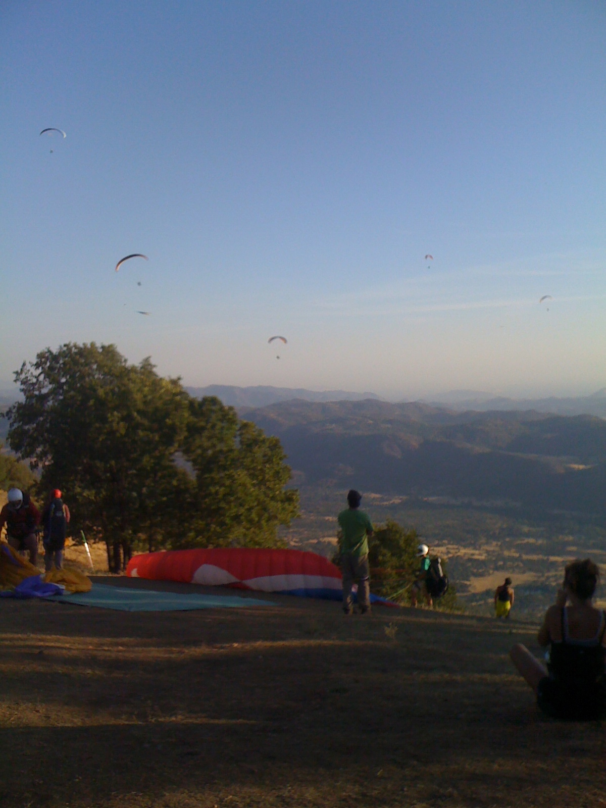 The XC guys, including participants in the Kansas Open, launched around noon. The thermals were strong and small, high pressure was making conditions a little challenging. We weren't getting too high, I only saw 6800' but did see a 16 mph headwind at one point. Kansas and Stephan (Haase) flew the furthest, making it just past Squaw Valley. Me, Bob Anderson, Marge and a few others landed at the Ranger Station. The newbies got the van on chase and swept us all up easily. We headed back up to launch for lunch before the evening flight.