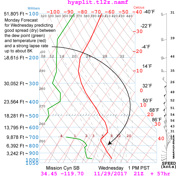 The basic scenario is a mild Santa Anna event that is fading, so there is a little less east wind each day. The best lapse rate still looks like Wednesday.